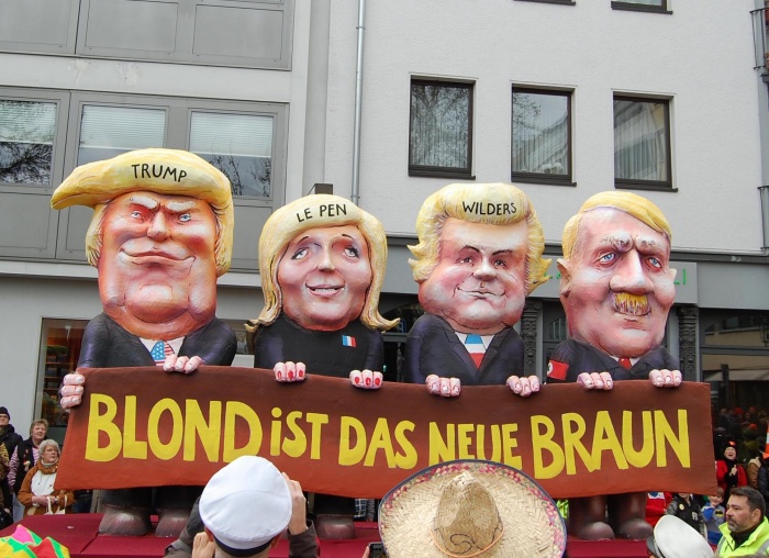 а вот и еще едкая сатира: четверка «коричневых», в их числе: тот же Трамп, француженка, лидер Национального фронта Марин Ле Пен, Голландский правый популист Герт Вилдерс в компании с… Гитлером…