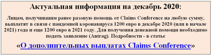 С 1 ноября 2012 года эти пострадавшие будут вправе подавать заявления на получение денежной выплаты за страдания, перенесенные ими во время Холокоста. Информация об этом содержится на русском, английском, иврите и немецком языках на сайте: «Claimsconference» .