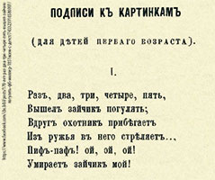 Без сомнения, «Подписи к картинкам» создавались под влиянием очень популярного в России сборника из десяти назидательных стихотворений «Struwwelpeter» (буквально – «Неряха Петер», в переводе названного «Стёпка-Растрёпка»), написанных франкфуртским психиатром Генрихом Гофманом для своего сына в 1845 году. Подобно подписям к картинкам в этом сборнике, Фёдор Миллер причудливо переплёл весёлые картинки с поистине жуткими. Вот и зайчика ни за что ни про что убивают...