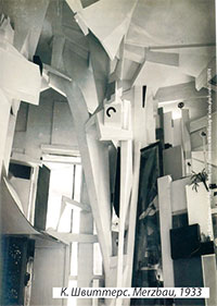 Тогда Курт основал своё личное движение – «Merz» (от слога рекламы «Kommerz- und Privatbank» в его коллаже). «Сколачивал», по законам композиции и цвета, «ассамбляжи» из хлама с чердаков и свалок (старых билетов, кусков древесины, гардеробных номерков, пуговиц и проч.). Взялся за «Merzbau», странную скульптуру из бумаги, картона и мусора. Годами (1923-1932) возводил в родительском доме колонну с нишами, посвященными друзьям-художникам (Ж. Арпу, П. Мондриану, Э. Лисицкому, К. Малевичу). Клал туда окурок, кончик галстука, обрывок шнурка, прядь волос – заклеивал, наносил новый слой – покрывал краской. Строение уперлось в потолок – пришлось его пробить, изгнав с верхнего этажа жильца. Так, художественно обработав бессмыслицу, Швиттерс создал свой Gesamtkunstwerk (синтетическое произведение искусства): «Грот любви», «Кафедру эротики», «Зал Гёте» – да ещё и с музыкой.
