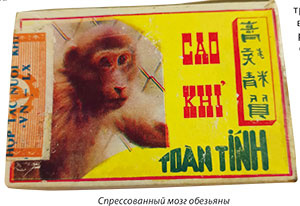 Во Вьетнаме из мозгов обезьяны делают сухой спрессованный экстракт. (см. фото) Но всякий раз, когда я думала сделать из него что-нибудь лечебное, тут же всплывали мои медицинские знания: именно в мозгах содержится большего всего холестерина. И вопрос отпадал сам собой!